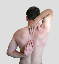 De pie, coloca una mano detrás de la cabeza y extiende la mano lo más que puedas por la mitad de la espalda. Apunta los dedos hacia abajo con la palma hacia la espalda. Ahora, con la otra mano, con la palma hacia afuera y los dedos hacia arriba, colócala detrás de la espalda y extiende la mano lo más que puedas hacia arriba sin sentir molestias. Intenta tocar los dedos de ambas manos. Si puedes tocar un lado pero no el otro, selecciona la opción de no tocar.